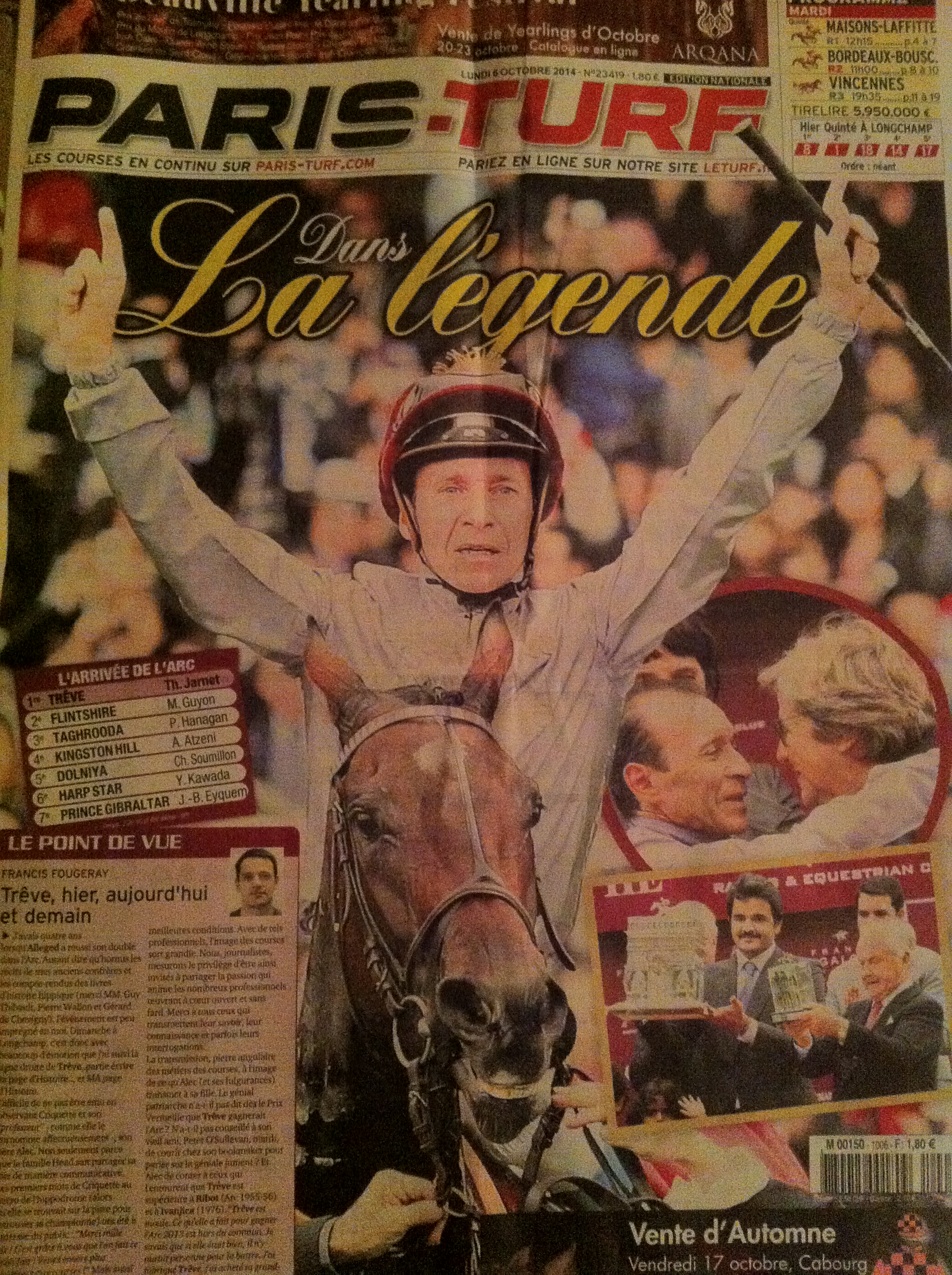 Dobbiamo ammettere il nostro madornale errore di valutazione e la bontà delle ragioni professate dal team della campionessa. Dall’allenatrice Criquette Head, che ha sempre difeso la sua pupilla da ogni attacco e che, dopo l’ultimo lavoro, aveva affermato che quest’ultima corsa la figlia di Motivator l’avrebbe fatta al meglio delle sue possibilità e purtroppo (per noi  fan) aveva ragione anche quando ha scelto di far scendere di sella Frankie per riportare sopra Treve il suo abituale fantino Thierry Jarnet, che ha montato in maniera perfetta, capendo alla perfezione cosa poteva dargli la sua campionessa. Dopo la corsa l’allenatrice era comprensibilmente in paradiso, le prime parole, davanti alle tribune gremite che l’acclamavano, sono state proprio per il pubblico: «Grazie mille volte! È grazie a tutti voi se siamo riusciti in questa impresa. Venite ancora più numerosi alle corse». Miglior spot per l’ippica è difficile da concepire.