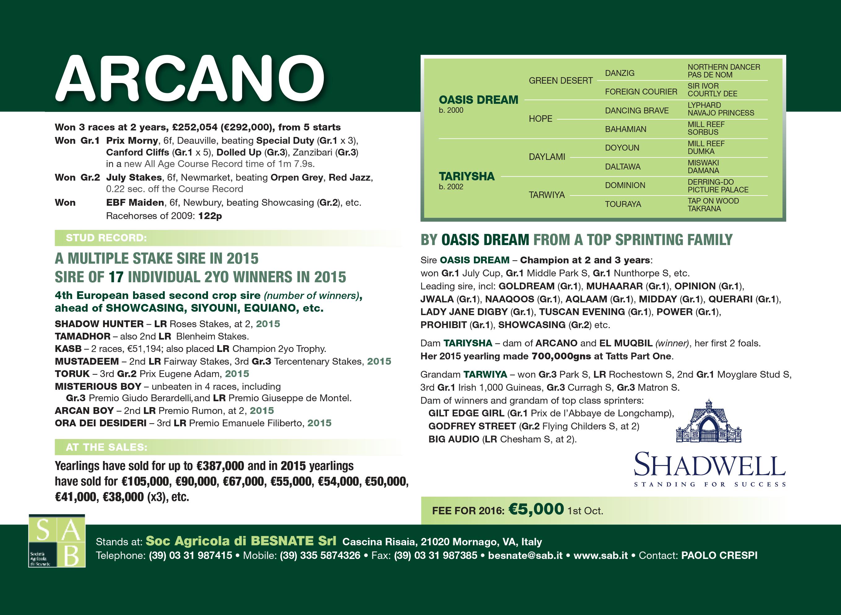 Arcano sarà di stanza alla SAB di Besnate e Pierantonio dove già operano stalloni come Mujahid, Champion Sire in Italia degli ultimi tre anni, Pounced, novità che sta dando ottimi prodotti in pista come ad esempio Cassina De Pomm, Ramonti, anche lui in gran spolvero quest’anno e Gladiatorus con i primi tre anni in pista quest’anno.