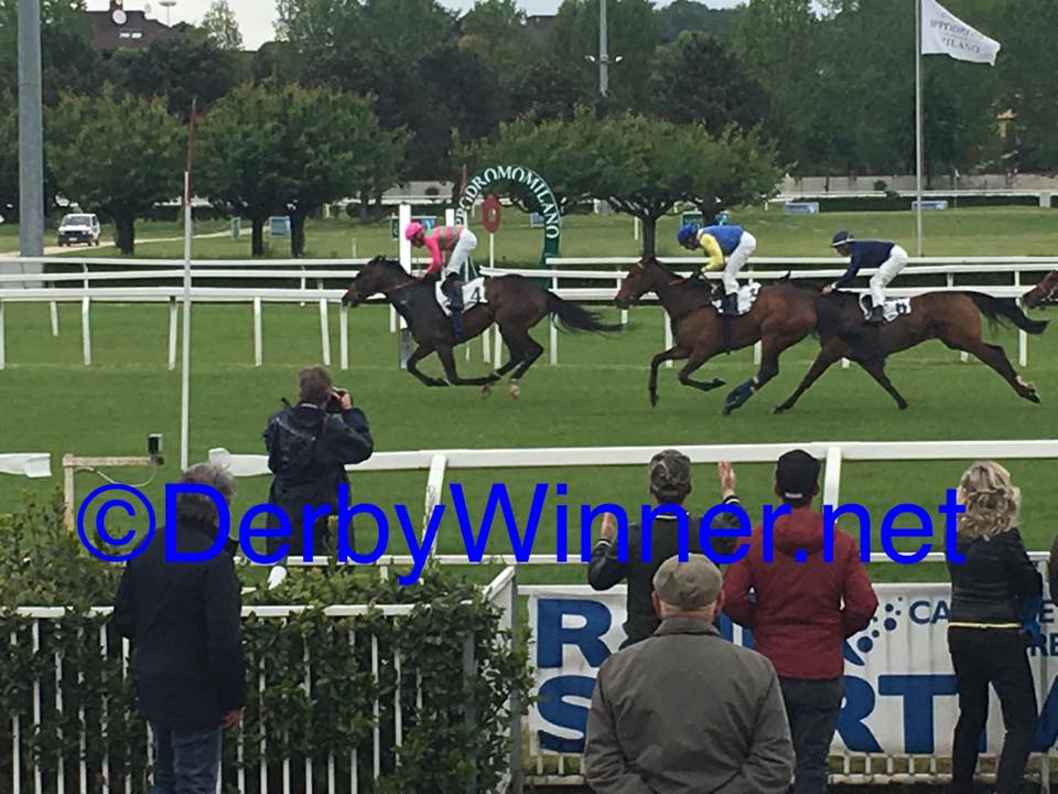 Il baio montato da Dario Vargiu si è comportato alla grandissima dando prova di gradire alquanto il terreno pesante di San Siro. Partito bene al terzo posto dietro al Vitabile Rockaroundtheclock (Starspangledbanner) e al tedesco Nabucco (Areion), sulla curva si è avvicinato al duo in testa che in retta cercava di anticipare i tempi della fuga. Nulla da fare con questo Greg Pass formato deluxe che non solo ricuciva agevolmente il distacco ma superava in progressione ai 500 finali anche Nabucco che nel frattempo era diventato leader.